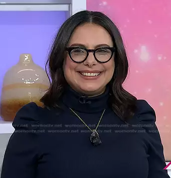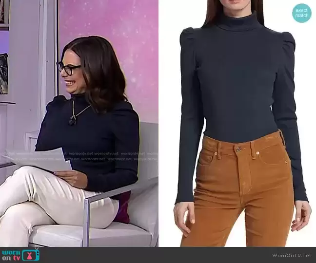 on Today on NBC was spotted wearing this navy puff sleeve turtleneck top on Today on Jan 05 2024's episode. 's Top is the Cedar Puff-Sleeve Turtleneck Top by Veronica Beard.