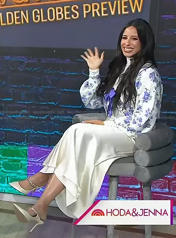 on Today on NBC was spotted wearing this floral tie neck cardigan on Today on Jan 05 2024's episode. 's Sweater is the Luan Cardigan in White And Blue by Majorelle . 's Shoes is the Bing 100 Embellished Patent Leather Mules in Linen by Jimmy Choo.