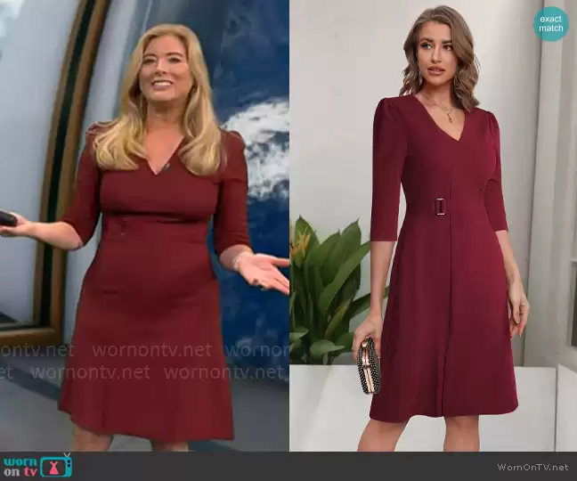 Kelly Cass on CBS Mornings on CBS was spotted wearing this Kelly Cass’ dark red v-neck dress on CBS Mornings on Jan 07 2024's episode. Kelly C's Dress is the Puff Sleeve Buckle Belted Dress in Burgundy by Shein .