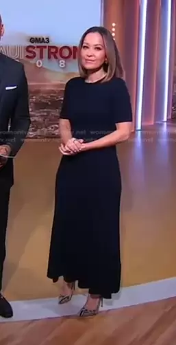 Eva Pilgrim on Good Morning America on ABC was spotted wearing this navy ribbed cutout dress on Good Morning America on Jan 08 2024's episode. Eva's Dress is the Rolora Long Cut-Out Knit Dress by Maje.