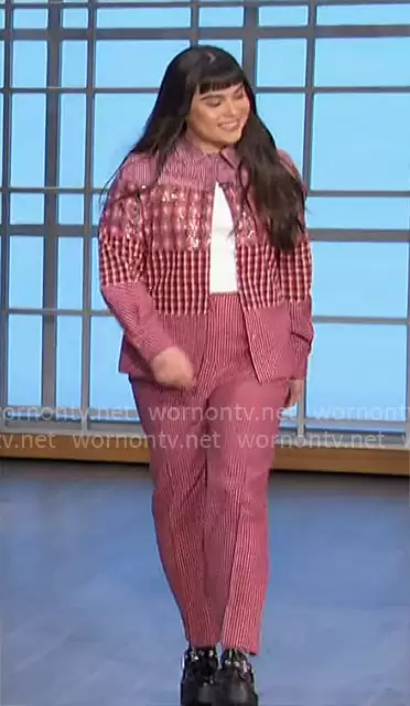 on The Talk on CBS was spotted wearing this Devery Jacobs’ red patchwork sequin shirt and pants on The Talk on Jan 08 2024's episode. 's Top is the Sequin Panel Shirt by Fendi . 's Pants is the Micro Madras Wool Pants by Fendi.
