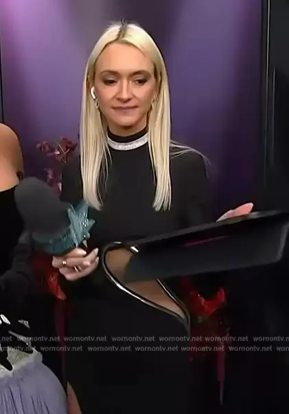 on Access Hollywood on NBC was spotted wearing this Zanna Roberts Rassi’s black cutout dress on Access Hollywood on Jan 09 2024's episode. 's Dress is the Paneled Embellished Jersey Gown by David Koma.