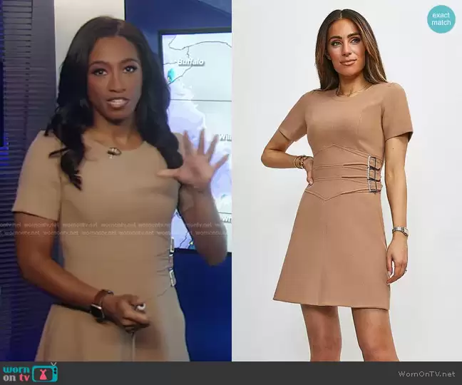 Brittany Bell on Good Morning America on ABC was spotted wearing this beige buckle waist dress on Good Morning America on Sep 09 2025's episode. Brittany's Dress is the Compact Stretch Buckle Detail A-Line Dress by Karen Millen.