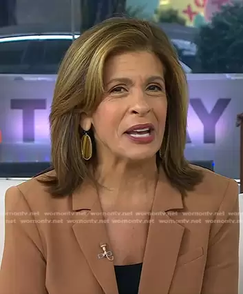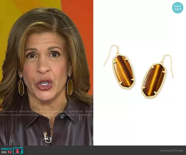 Hoda Kotb on Today on NBC was spotted wearing this brown tigers eye drop earrings on Today on Jan 31 2024's episode. Hoda's Earrings is the Gold Plated Elle Drop Earrings in Brown Tigers Eye by Kendra Scott.