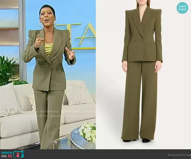 Tamron Hall on Tamron Hall Show on ABC was spotted wearing this olive blazer and pants on Tamron Hall Show on Jan 10 2024's episode. Tamron's Blazer is the Double-Breasted Square Lapel Jacket by Sergio Hudson . Tamron's Pants is the Signature Wool Straight Leg Pants by Sergio Hudson.