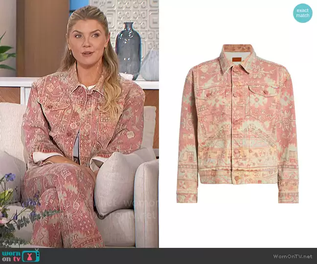 Amanda Kloots on The Talk on CBS was spotted wearing this printed jacket and matching jeans on The Talk on Jan 10 2024's episode. Amanda's Jacket is the The Mountain Drifter Geometric Denim Jacket by Mother . Amanda's Pants is the The Super Cruiser Geometric Flared Jeans by Mother.