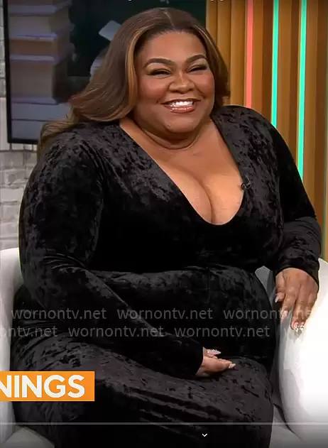on CBS Mornings on CBS was spotted wearing this black velvet dress on CBS Mornings on Jan 11 2024's episode. 's Dress is the Crushed Velvet Deep V Neck Midi Dress by Good American .
