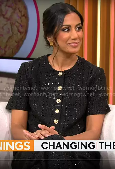on CBS Mornings on CBS was spotted wearing this black tweed set on CBS Mornings on Jan 11 2024's episode. 's Top is the Braswell Top in Watkins Tweed by Amanda Uprichard . 's Pants is the Jane Pants in Watkins Tweed by Amanda Uprichard.