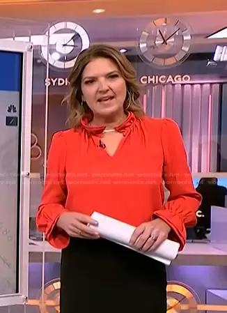 on NBC News Daily on NBC was spotted wearing this Christine Romans’ red ruffle neck blouse on NBC News Daily on Jan 11 2024's episode. 's Top is the Ruffleneck Top by J. Crew.