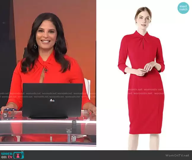 Darlene Rodriguez on Today on NBC was spotted wearing this red twisted neck dress on Today on Jan 12 2024's episode. Darlene's Dress is the Stretch Crepe 3/4 Sleeve Twisted Neckline Sheath Dress by Donna Morgan.