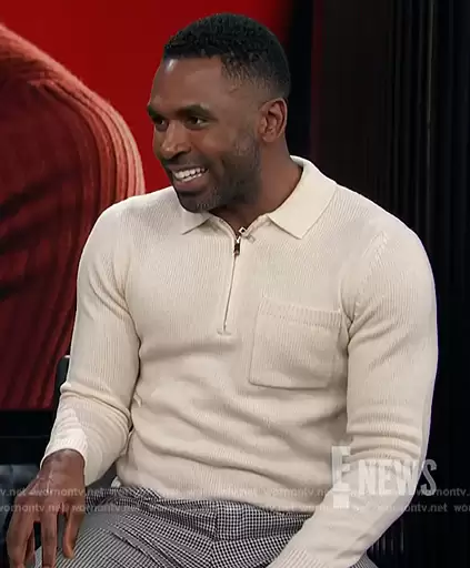 Justin Sylvester on E! News on E! was spotted wearing this white knit polo sweater on E! News on Jan 12 2024's episode. Justin's Sweater is the Fleetwood Half Zip Sweater by Reiss.