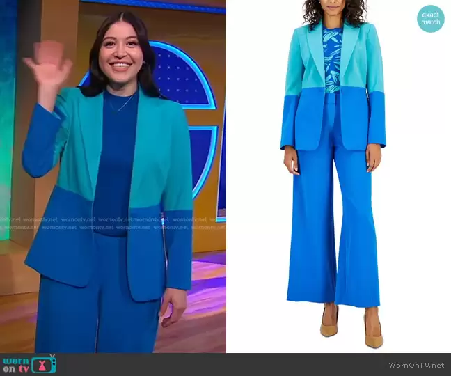 on Good Morning America on ABC was spotted wearing this blue colorblock suit on Good Morning America on Jan 15 2024's episode. 's Jacket is the Colorblocked Boyfriend Blazer by Tahari ASL . 's Pants is the Mid-Rise Wide-Leg Pants by Tahari ASL.