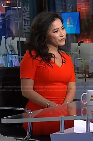 on NBC News Daily on NBC was spotted wearing this red v-neck sheath dress on NBC News Daily on Jan 15 2024's episode. 's Dress is the Damaisa Sheath Dress by Boss.