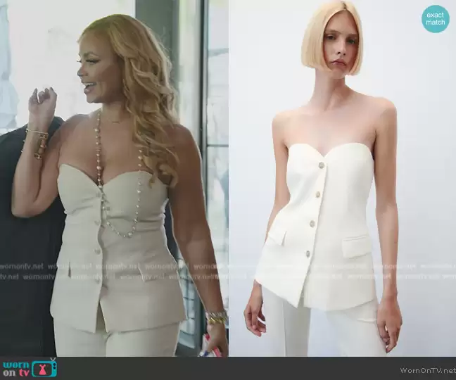 Gizelle Bryant on The Real Housewives of Potomac on Bravo was spotted wearing this white strapless top on The Real Housewives of Potomac on episode 'Hard Conversations' (8x09) in Jan 2024. Gizelle's Top is the Bustier Top by Zara . Gizelle's Necklace is the Faux Pearl CC Station Long Necklace by Chanel . Gizelle's Bag is the Lady Dior Micro Bag by Dior.