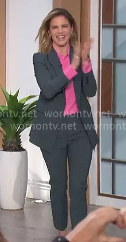 Natalie Morales on The Talk on CBS was spotted wearing this grey suit and pink blouse on The Talk on Jan 16 2024's episode. Natalie's Top is the Carrera Blouse by A.L.C. . Natalie's Jacket is the Etiennette Blazer in Blue Granite by Theory . Natalie's Pants is the Treeca Pants in Blue Granite by Theory.
