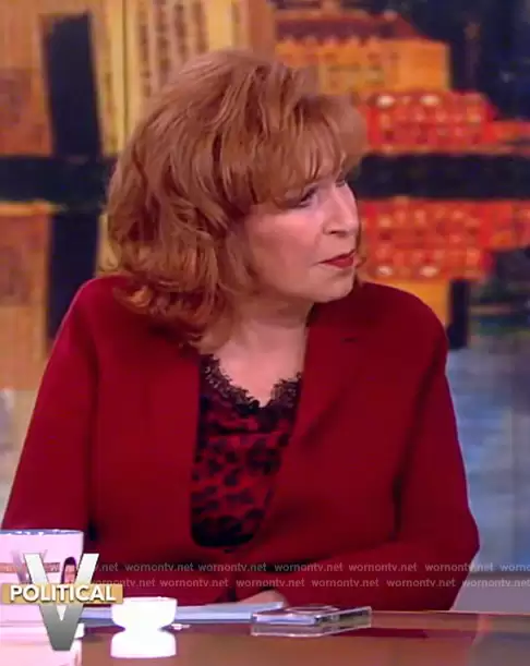 Joy Behar on The View on ABC was spotted wearing this red leopard lace trim cami on The View on Jan 16 2024's episode. Joy's Top is the Leopard Trim Cami by Anine Bing.