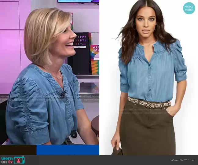Kate Snow on NBC News Daily on NBC was spotted wearing this denim puff sleeve top on NBC News Daily on Jan 16 2024's episode. Kate's Top is the Ultra-Soft Chambray Puff-Sleeve Shirt by New York & company.