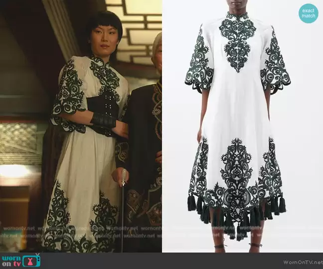 Eleanor Chun (played by Karoline) on Death and Other Details on Hulu was spotted wearing this white embroidered dress on Death and Other Details on episode 'Sordid' (1x02) in Jan 2024. Eleanor's Dress is the Anneke Tassel-trimmed Embroidered Linen Dress by Zimmermann.