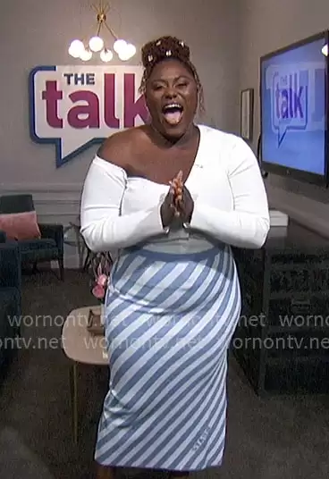 on The Talk on CBS was spotted wearing this Danielle Brooks’ white off shoulder cardigan and blue diagonal stripe skirt on The Talk on Jan 17 2024's episode. 's Top is the Craftsman Asymmetric Sweater by Staud . 's Skirt is the Giovanni Stripe Skirt by Staud.