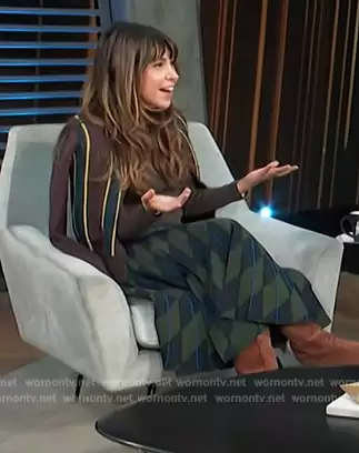 on Access Hollywood on NBC was spotted wearing this green skirt and brown sweater on Access Hollywood on Jan 17 2024's episode. 's Sweater is the Striped Zip Front Cardigan by Tory Burch . 's Skirt is the Jacquard pleated midi skirt by Tory Burch.