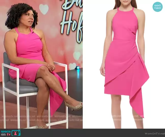 on Access Hollywood on NBC was spotted wearing this pink asymmetric dress on Access Hollywood on Jan 17 2024's episode. 's Dress is the Draped Halter Dress by Vince Camuto.