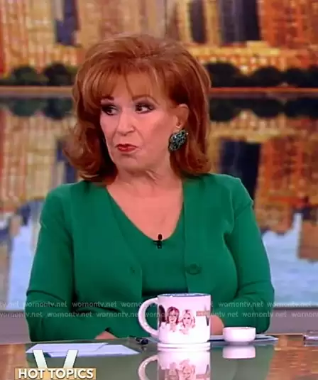 Joy Behar on The View on ABC was spotted wearing this green cardigan on The View on Jan 19 2024's episode. Joy's Sweater is the Wool Florence Button Front Sweater by Kobi Halperin.