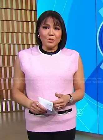 Stephanie Ramos on Good Morning America on ABC was spotted wearing this pink knit vest on Good Morning America on Jan 19 2024's episode. Stephanie's Sweater is the Clove-Detail Sleeveless Jumper by Maje.