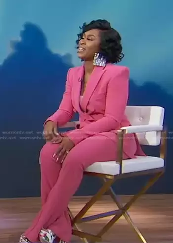 on Good Morning America on ABC was spotted wearing this pink suit on Good Morning America on Jan 19 2024's episode. 's Jacket is the Fitted Double Breasted Blazer in Garnet Rose by Alex Perry . 's Pants is the Flare Trouser in Garnet Rose by Alex Perry.
