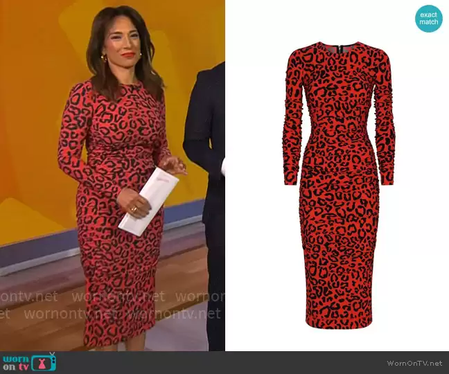 Michelle Miller on CBS Mornings on CBS was spotted wearing this red leopard print dress on CBS Mornings on Dec 26 2024's episode. Michelle's Dress is the Jersey Leopard Print Midi Dress by Dolce & Gabbana .