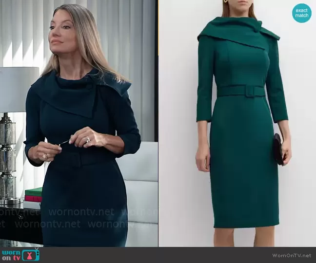 On the set of GH, Nina’s sartorial choices are as captivating as her storyline, and her latest outfit – the Reo belted 3/4 sleeve sheath dress in forest by Badgley Mischka Collection – is no exception. This dark green dress, exuding a Mad Men-esque vibe, marries retro charm with contemporary sophistication. The statement foldover neckline, adorned with a solitary button, adds a unique twist to the classic sheath silhouette, creating an ensemble that commands attention in any room, fictional or otherwise. It's not just a dress; it's an emblem of power dressing, tailored for the modern woman who juggles complex roles with ease. The belt cinches at the waist, accentuating Nina's figure, while the rich forest green hue complements her on-screen persona's bold and enigmatic nature. In this garment, Nina perfectly encapsulates the essence of a character who is as multifaceted in her fashion choices as she is in her life, making a clear statement that in the world of 'General Hospital', style and substance go hand in hand.
