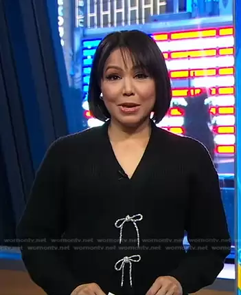 Stephanie Ramos on Good Morning America on ABC was spotted wearing this black bow embellished cardigan on Good Morning America on Jan 22 2024's episode. Stephanie's Sweater is the Babysoft Sparkly Bow Cardigan by French Connection.