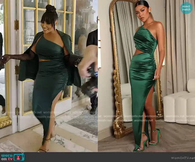Mia Thornton on The Real Housewives of Potomac on Bravo was spotted wearing this emerald satin ruched dress on The Real Housewives of Potomac on episode 'Friendship Is a Mother' (8x10) in Jan 2024. Mia's Dress is the Moscato Please Maxi Dress - Hunter by Fashion Nova.