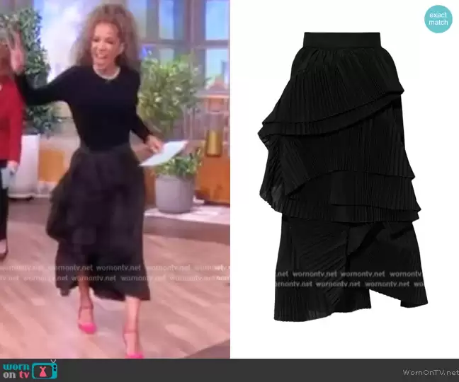 Sunny Hostin on The View on ABC was spotted wearing this black ruffle skirt on The View on Jan 17 2024's episode. Sunny's Skirt is the Pleated Skirt With Ruffles by Dries Van Noten.