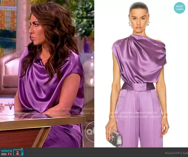 Alyssa Farah Griffin on The View on ABC was spotted wearing this purple satin drape top and pants on The View on Jan 22 2024's episode. Alyssa's Top is the Draped Top by The Sei . Alyssa's Pants is the Wide Leg Trouser by The Sei.