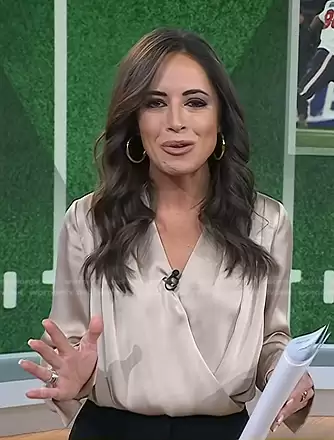 Kaylee Hartung on Today on NBC was spotted wearing this grey satin wrap blouse on Today on Feb 08 2024's episode. Kaylee's Bodysuit is the Surplice Long Sleeve Satin Bodysuit by Favorite Daughter.