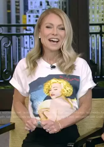 Kelly Ripa on Live with Kelly and Mark on Disney ABC Home Entertainment was spotted wearing this Madonna print tee on Live with Kelly and Mark on Jan 23 2024's episode. Kelly's Top is the Blond Ambition Tour Vintage Tee by Madonna.