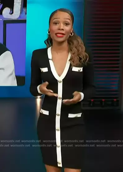 Zuri Hall on Access Hollywood on NBC was spotted wearing this black contrast trim dress on Access Hollywood on Jan 23 2024's episode. Zuri's Dress is the Uzma Knit V-Neck Mini Bodycon Dress by L'Agence.