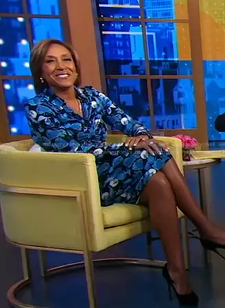 Robin Roberts on Good Morning America on ABC was spotted wearing this black and blue print shirtdress on Good Morning America on Jan 24 2024's episode. Robin's Dress is the Sheska Dress in Passion Petals Star Sapphire by Diane von Furstenberg.