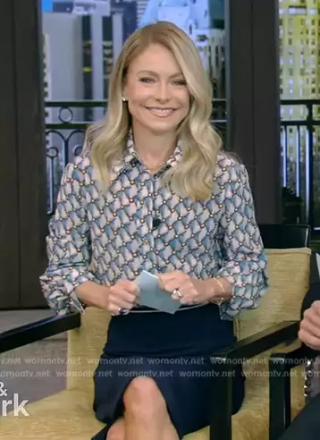 Kelly Ripa on Live with Kelly and Mark on Disney ABC Home Entertainment was spotted wearing this floral print blouse on Live with Kelly and Mark on Jan 24 2024's episode. Kelly's Top is the Floral Print Silk Shirt by Etro . Kelly's Skirt is the Arreton Skirt by Roland Mouret.