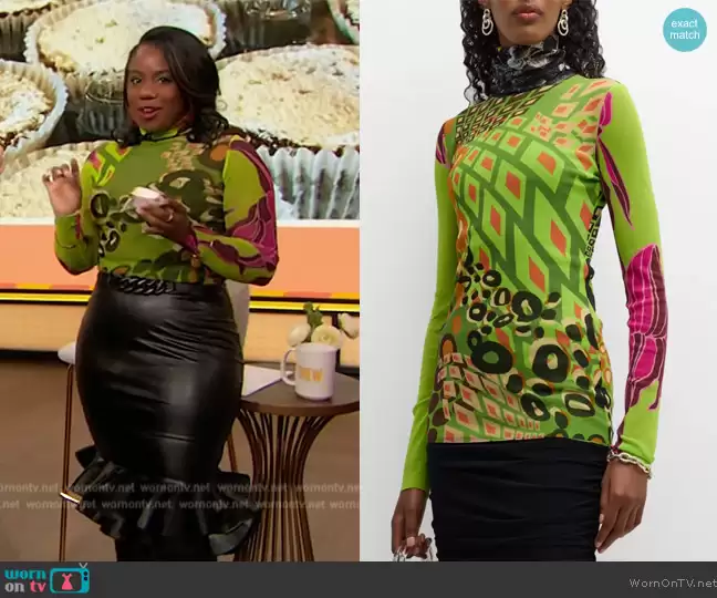 on The Drew Barrymore Show on CBS was spotted wearing this Chelsea Haynes green floral abstract print top on The Drew Barrymore Show on Jan 24 2024's episode. 's Top is the Abstract-Print Turtleneck Tulle Shirt by Fuzzi.