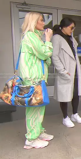 Erika Jayne on The Real Housewives of Beverly Hills on Bravo was spotted wearing this green marble print jacket and pants on The Real Housewives of Beverly Hills on episode 'Tapas and Tattletales' (13x13) in Jan 2024. Erika's Jacket is the Truecasuals Printed Tracktop by Adidas by Stella McCartney . Erika's Pants is the Truecasuals Printed Track Pants by Adidas by Stella McCartney . Erika's Sneakers is the 9060 Inside Voices Baby Shower Blue by New Balance x Joe Freshgoods . Erika's Bag is the Keepall Bandouliere Bag by Louis Vuitton x Jeff Koons.