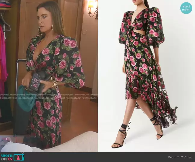 Kyle Richards on The Real Housewives of Beverly Hills on Bravo was spotted wearing this black floral cutout dress on The Real Housewives of Beverly Hills on episode 'Tapas and Tattletales' (13x13) in Jan 2024. Kyle's Dress is the Katia Twist-Front Maxi Dress by Alice + Olivia . Kyle's Bag is the Jodie Bag by Bottega Veneta . Kyle's Bag is the Kelly 25 Bag by Hermes . Kyle's Shoes is the Lupita Leather Wedge Mules by Amina Muaddi.