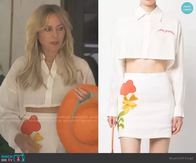 Sutton Stracke on The Real Housewives of Beverly Hills on Bravo was spotted wearing this white cropped shirt and mini skirt on The Real Housewives of Beverly Hills on episode 'Tapas and Tattletales' (13x13) in Jan 2024. Sutton's Top is the Slogan-Embroidered Long-Sleeve Cropped Shirt by Marni . Sutton's Skirt is the Slogan-Embroidered Skirt by Marni . Sutton's Bag is the Marcel Raffia-Effect Tote Bag by Marni x No Vacancy Inn . Sutton's Hat is the Raffia Cutout Hat by Marni x No Vacancy Inn.