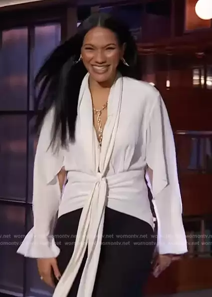 on The Kelly Clarkson Show on NBC was spotted wearing this white two-tone gown on The Kelly Clarkson Show on Jan 25 2024's episode. 's Dress is the Contrast Gown with Tie Detail by Victoria Beckham.