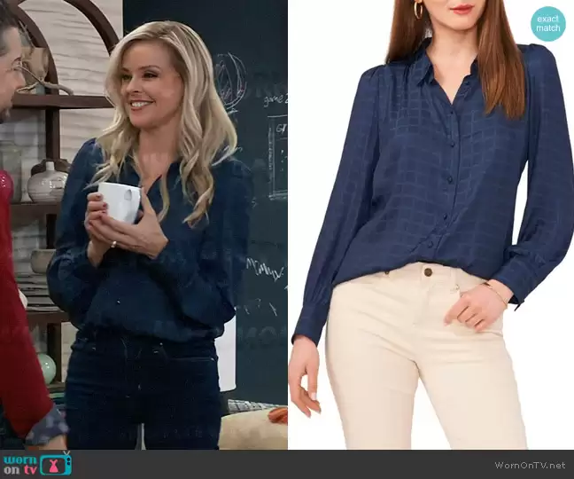 GH's Felicia has once again captured attention with her impeccable sense of style, this time with a navy checked blouse that perfectly balances classic charm with contemporary design. This top, a tonal plaid jacquard button up shirt by Vince Camuto, showcases a slightly sheer fabric adorned with a subtle yet sophisticated windowpane check pattern. The blouse's design cleverly integrates slightly puffed sleeves, offering a structured look that maintains the softness and fluidity of the fabric. The button-front detail adds a touch of traditional elegance, making it versatile for both on-screen drama and off-screen chic. Felicia’s choice of this blouse reflects a keen understanding of how to blend patterns and textures to create an outfit that’s both visually intriguing and effortlessly stylish. The navy checked blouse is not just a piece of wardrobe; it's a statement about the enduring allure of classic patterns reimagined for the modern woman. It's a testament to the idea that fashion on daytime television can be as nuanced and dynamic as the stories themselves, inspiring viewers to explore the art of dressing with a fresh perspective.