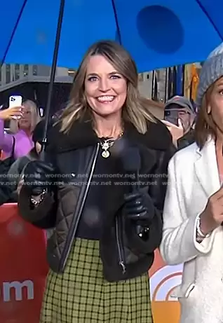 Savannah Guthrie on Today on NBC was spotted wearing this quilted leather jacket on Today on Jan 26 2024's episode. Savannah's Jacket is the Tulip Quilted Sheepskin Jacket with shearling trim in Dark Olive by Mackage.