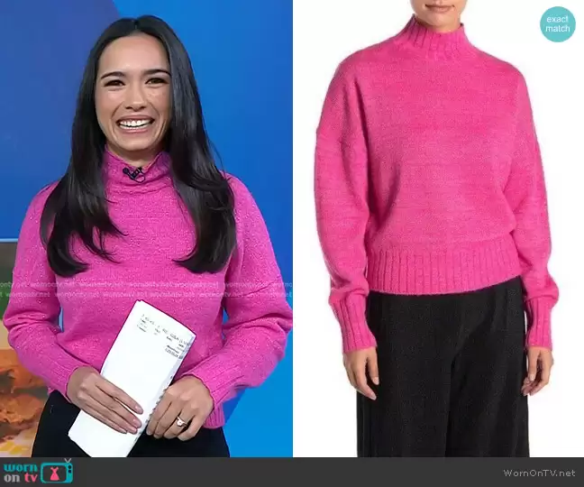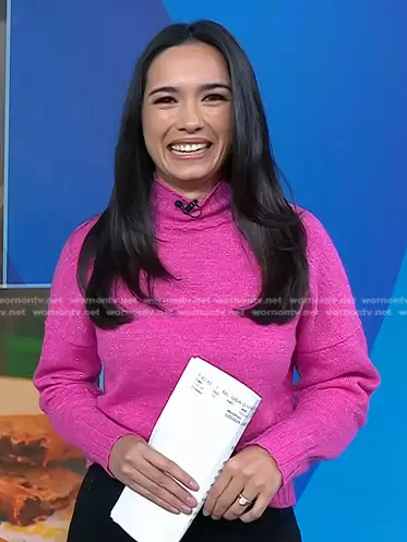 Emilie Ikeda on Today on NBC was spotted wearing this metallic pink sweater on Today on Mar 29 2024's episode. Emilie's Sweater is the Mock Neck Knit Metallic Sweater in Metallic Specked by NSR.