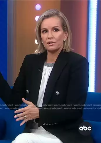 Dr. Jennifer Ashton on Good Morning America on ABC was spotted wearing this Jennifer’s white jewel neck top and black blazer on Good Morning America on Jan 26 2024's episode. Jennifer's Top is the Cotton Short-Sleeve Blouse by Brunello Cucinelli . Jennifer's Jacket is the Miller Dickey Jacket in Black with Silver Buttons by Veronica Beard.