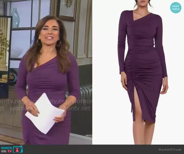 Michelle Miller on CBS Mornings on CBS was spotted wearing this purple ruched asymmetric dress on CBS Mornings on Jan 28 2024's episode. Michelle's Dress is the Asymmetric Shirred Long Sleeve Dress by Rachel Parcell .
