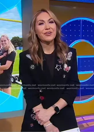 Lori Bergamotto on Good Morning America on ABC was spotted wearing this black butterfly embellished blazer on Good Morning America on Jan 29 2024's episode. Lori's Jacket is the Beaded Butterfly Blazer by Cinq a Sept.